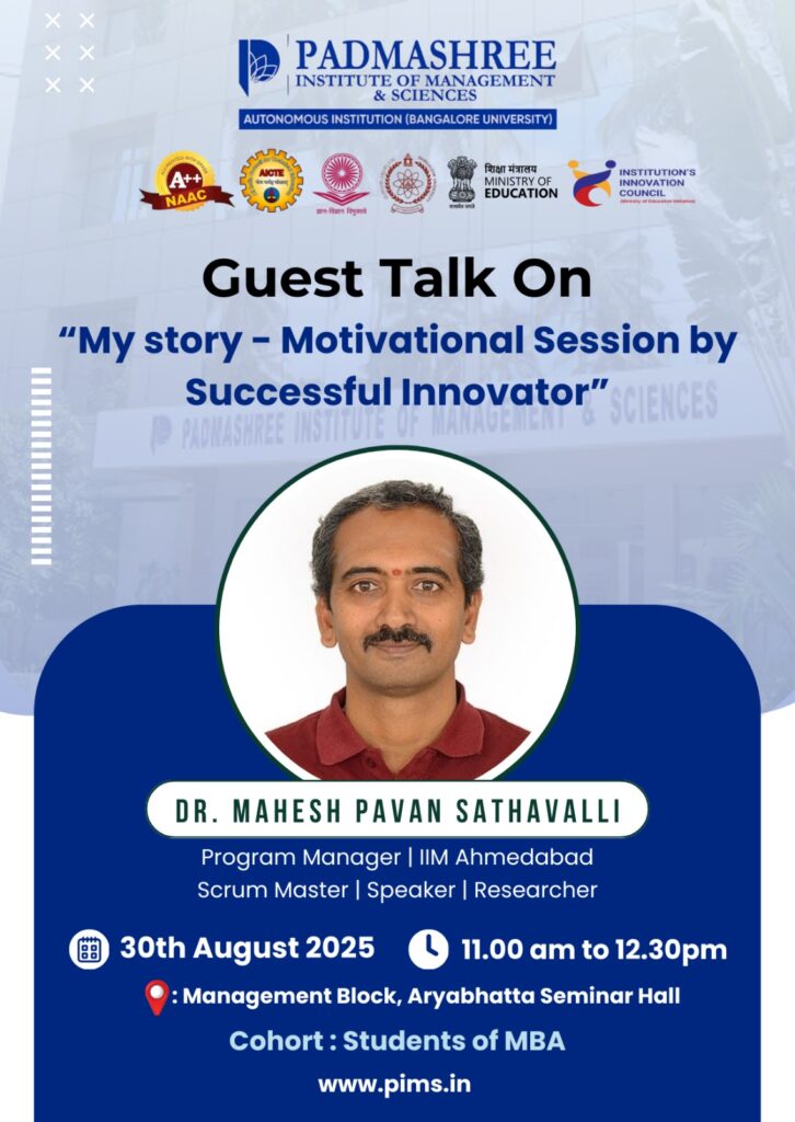 Padmashree Institute of Management & Sciences (PIMS) is delighted to announce a Guest Talk on the inspiring theme “ My Story – Motivational Session by Successful Innovator.