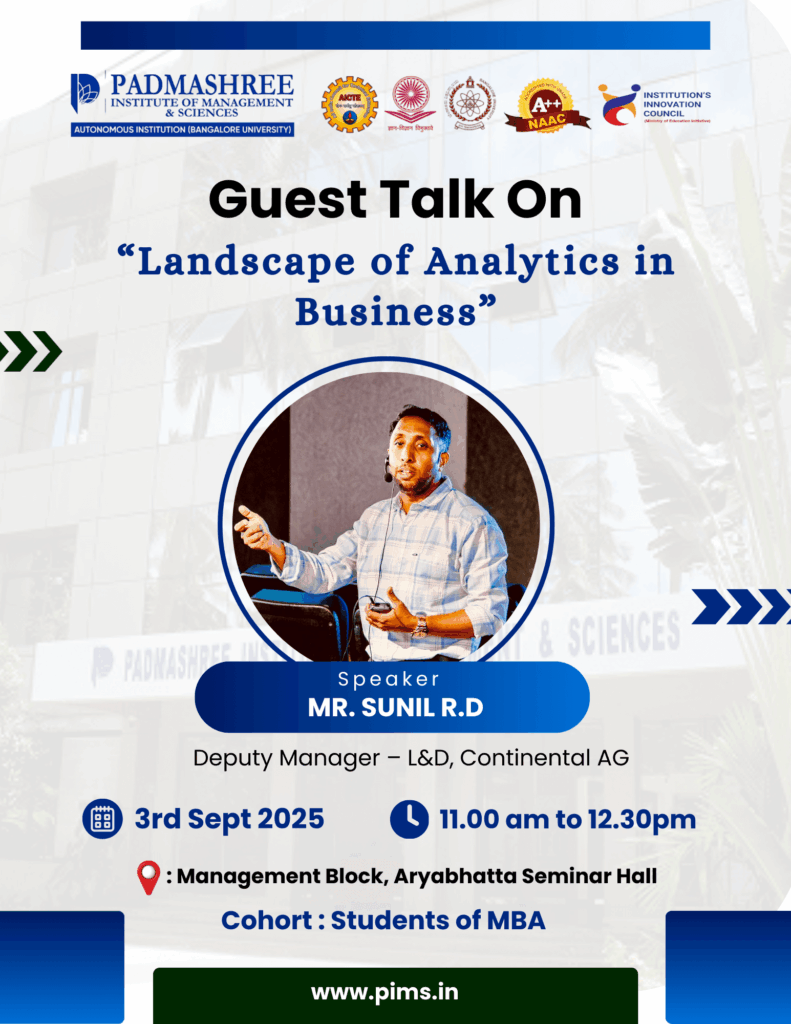 Padmashree Institute of Management & Sciences (PIMS) is proud to host an expert session on the “ Landscape of Analytics in Business”, exclusively for MBA students. The session will be delivered by Mr. Sunil R.D., Deputy Manager – L&D at Continental AG, brings valuable industry insights and practical knowledge on how analytics is shaping the future of business decision-making.