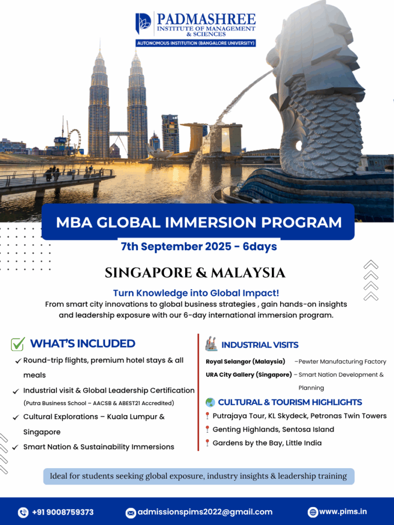 Padmashree Institute of Management & Sciences (PIMS) proudly presents its MBA Global Immersion Program, a transformative 6-day journey to Singapore & Malaysia this September 2025. Designed exclusively for a select group of 30 students, this program combines academic learning, global business exposure, and unforgettable cultural experiences.